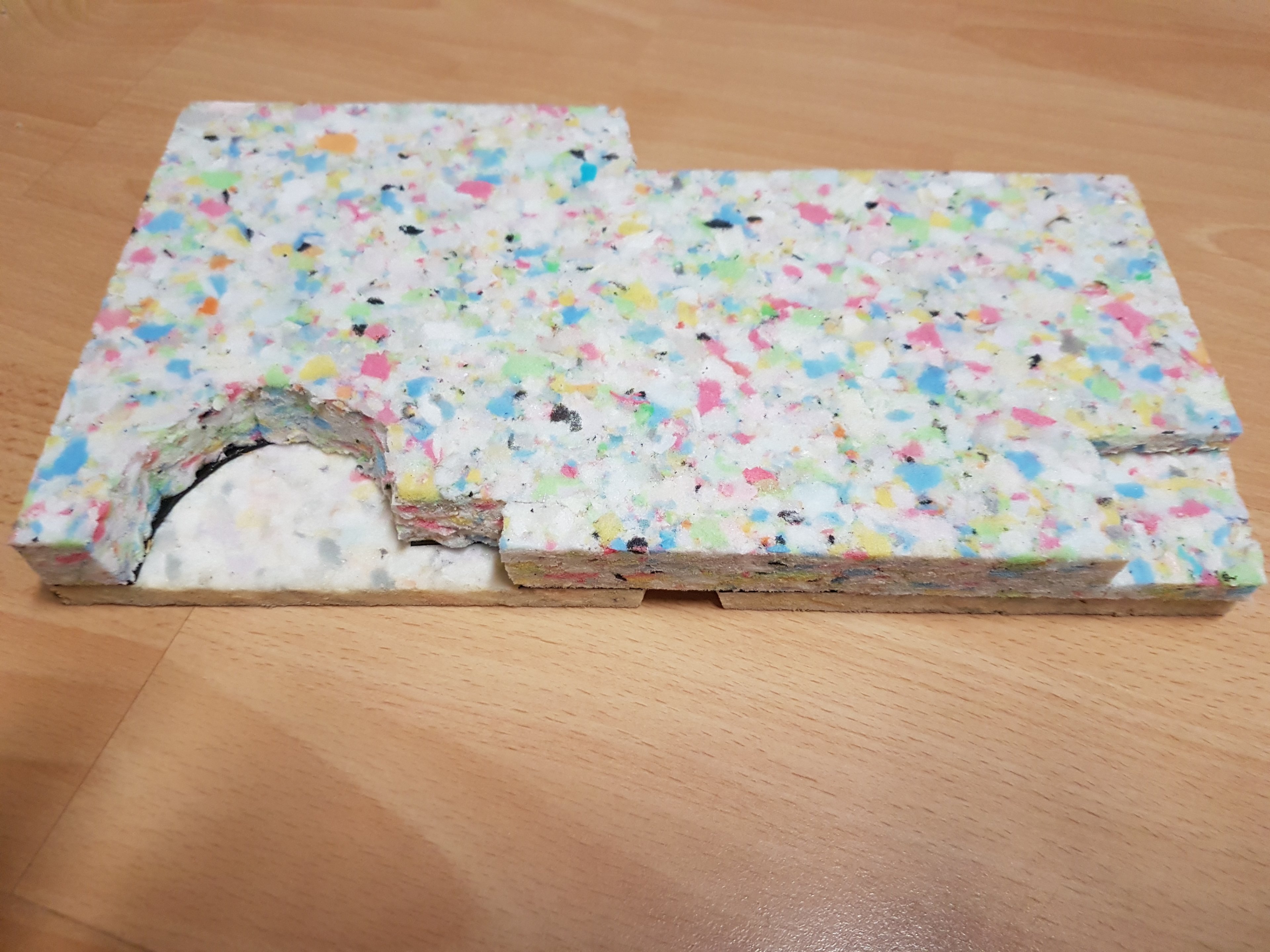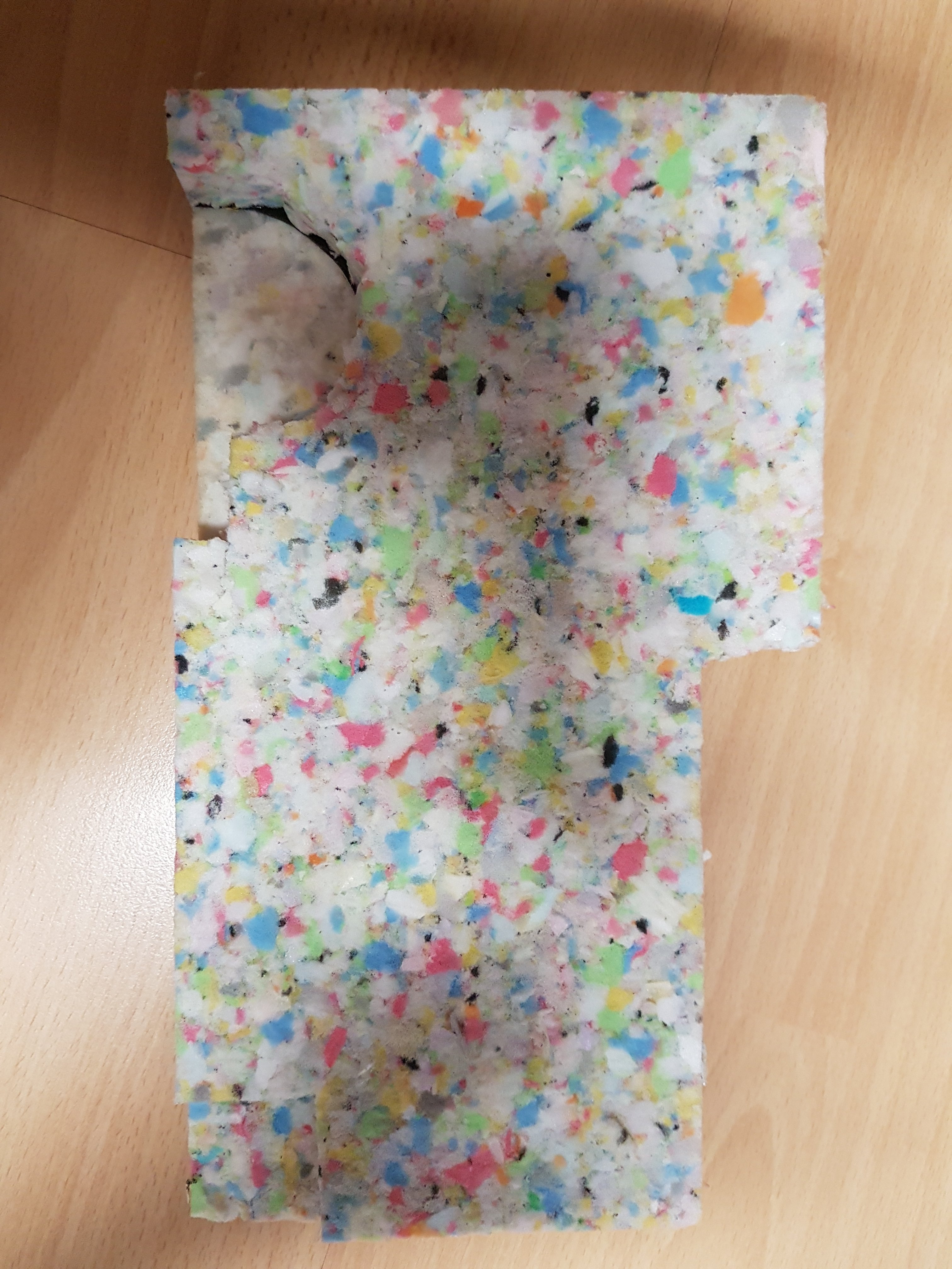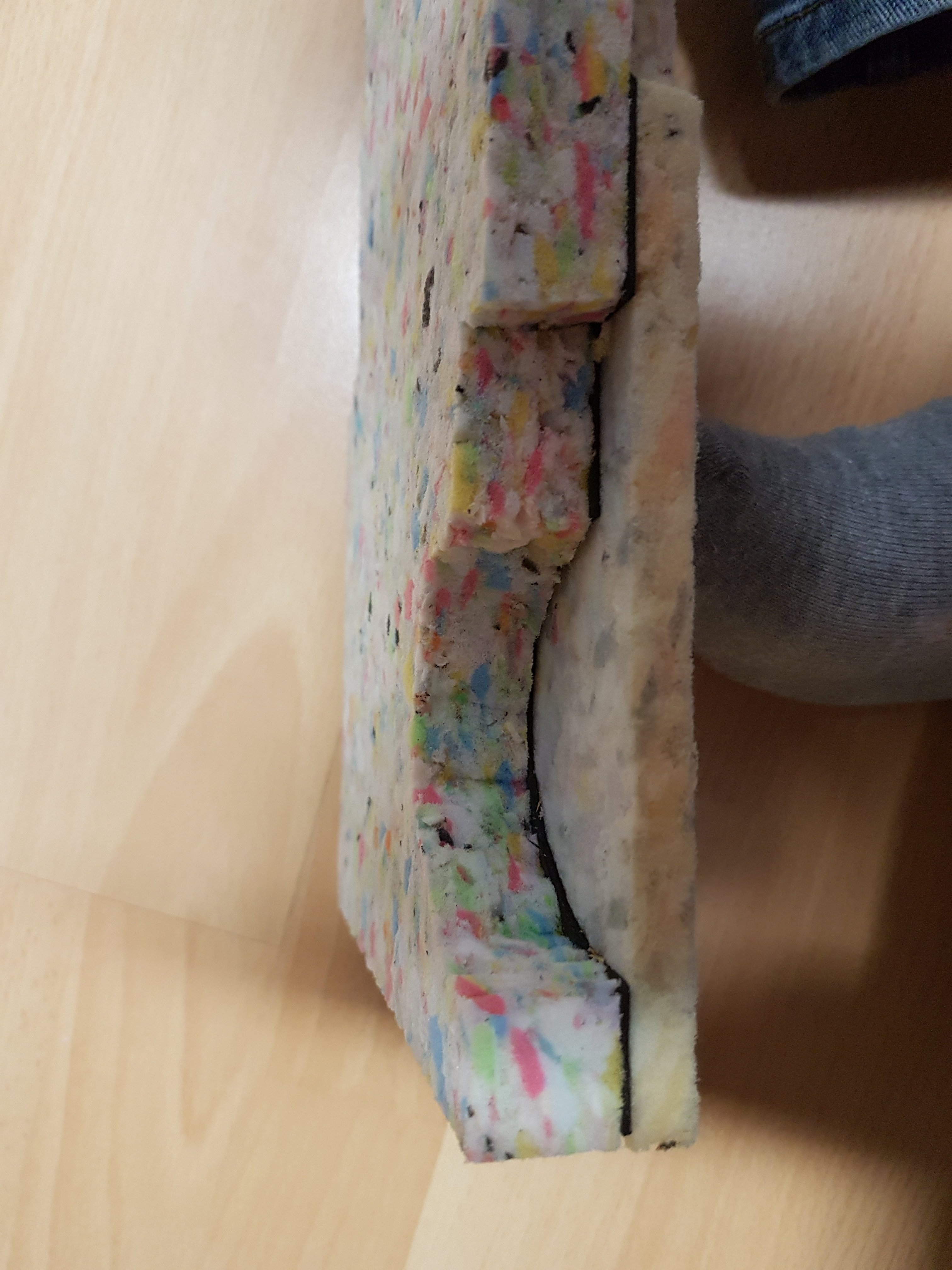 Man sieht sehr gut, dass die Schaummatten aus Schaumresten zusammengekleistert sind. Hier drei Matten in 0,5cm, 1cm und 2cm Dicke: