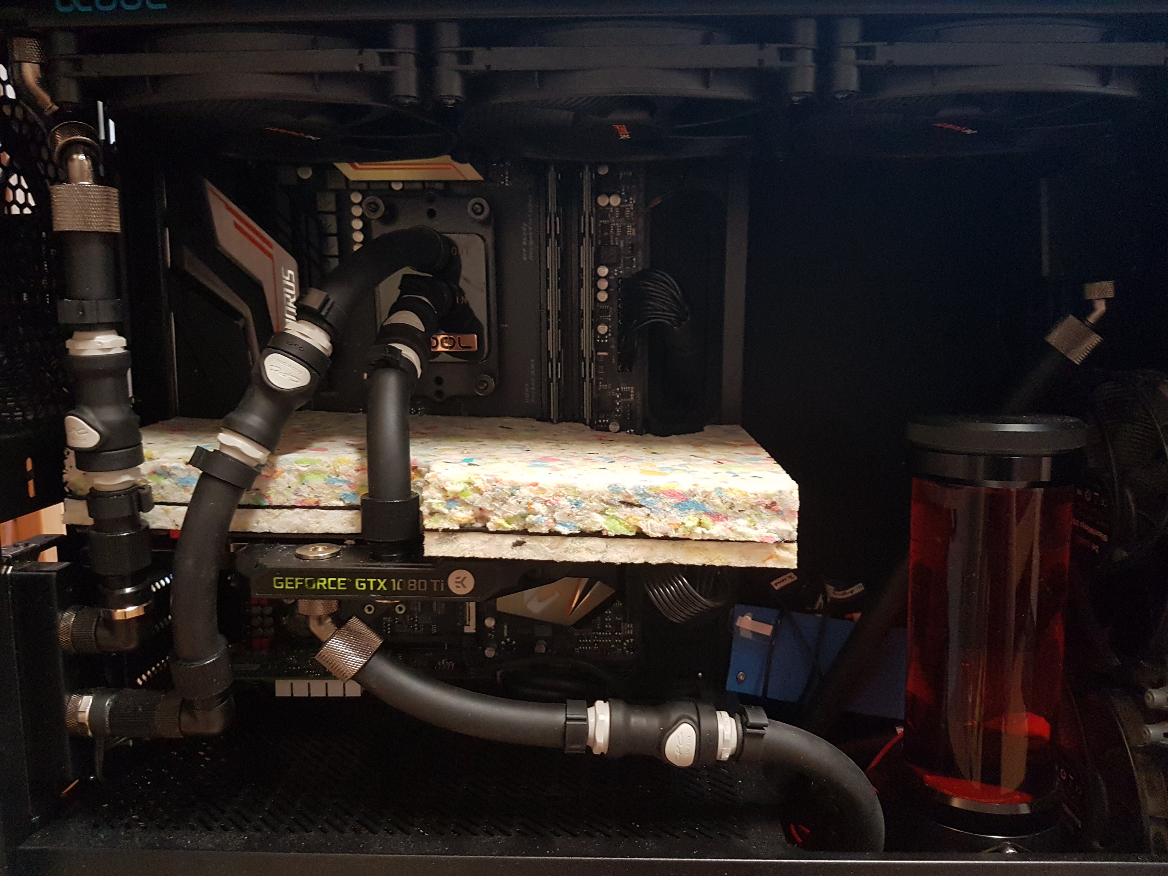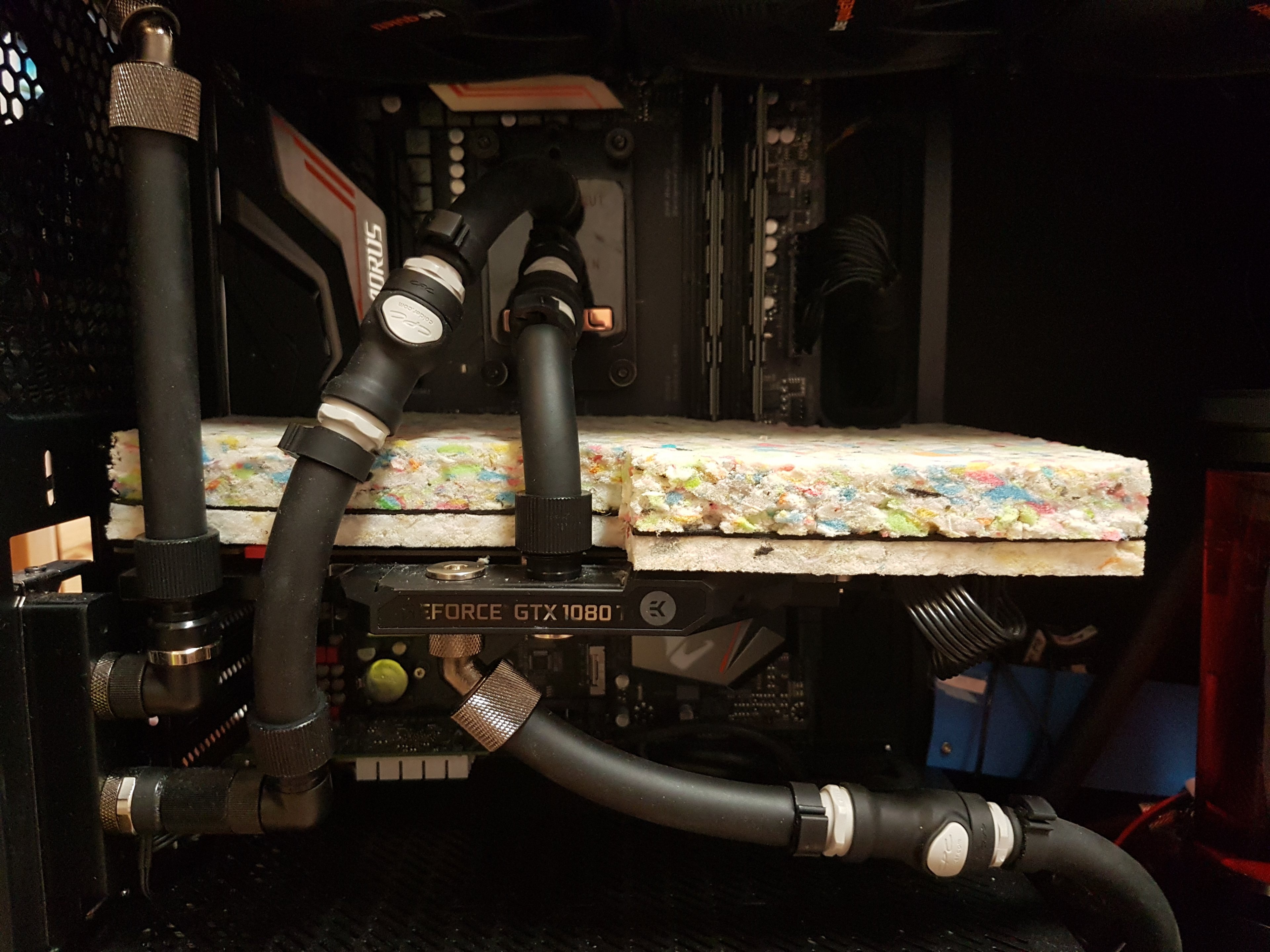 Ansonsten hat das mir natürlich eine Schwäche im Kreislauf gezeigt. Sobald ich wieder ein QDC habe um den Teil vom Loop nochmal zu entleeren, werde ich den überkomplizierten Teil vom Anschluss beim Radiator umbauen auf etwas, das vielleicht weniger gut aussieht, aber deutlich weniger fehleranfällig ist, weil ich konnte sogar eine Situation wo ein Leck entsteht ohne dass etwas aufgeschraubt wird reproduzierbar erzeugen. Nicht gut. Da ist mir dann die Funktionalität wie immer wichtiger als die Optik.