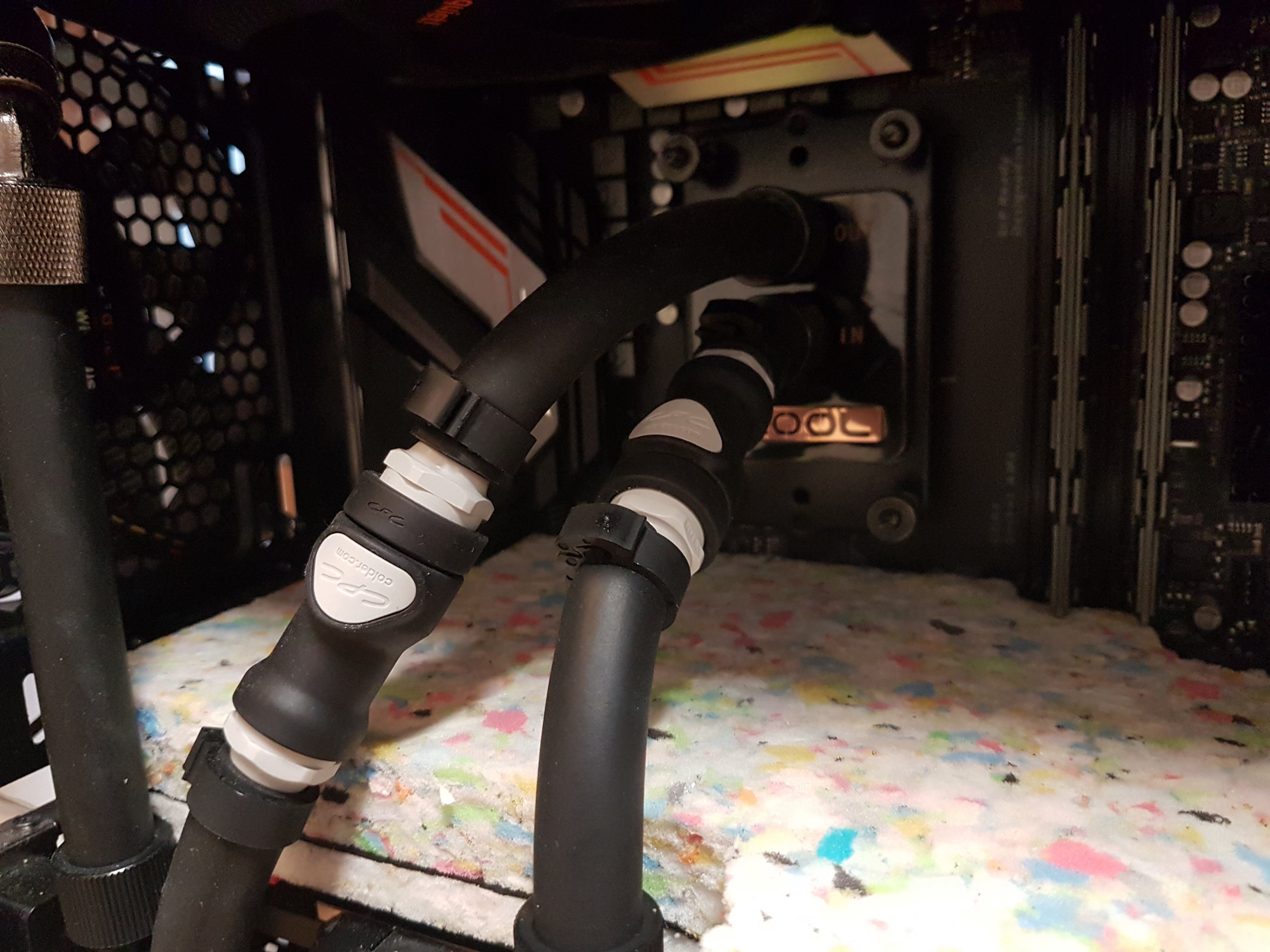 Beim Segment zwischen GPU und CPU wollte ich zuerst einen extra dafür bestellten 45° Winkel verbauen, aber es war ganz schnell offensichtlich, dass dann kein Platz für Schlauchstücke mehr wären, womit es nicht gut möglich wäre, den QDC tatsächlich zu öffnen. Nicht Sinn der Sache. Daher jetzt wie vorher nur mit QDC in der Mitte und beim QDC ist an beiden Enden der Schlauch so geschnitten um einen leichten Winkel zu ermöglichen.