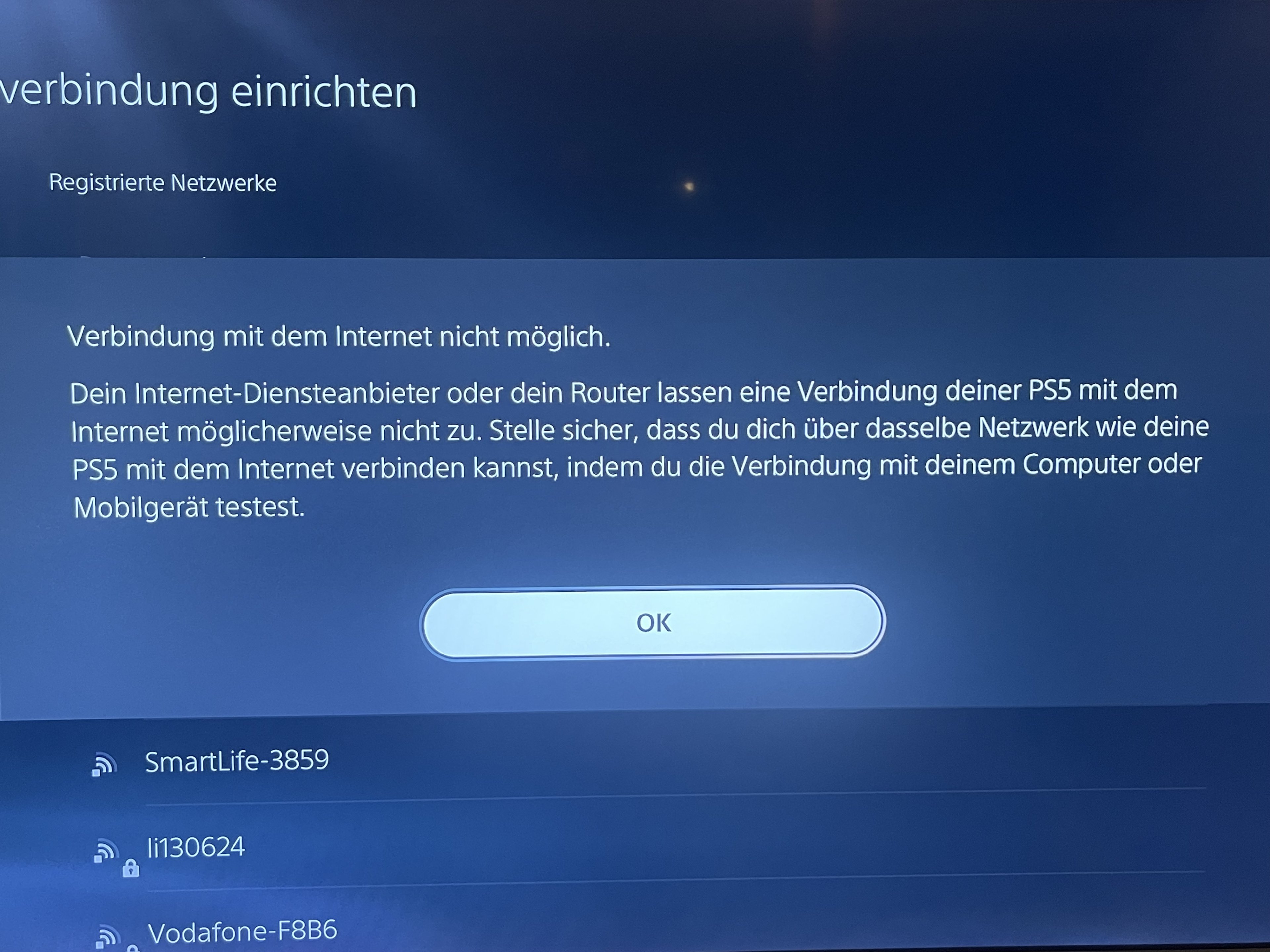 ich hab das Problem das meine PS5 sich nicht mit dem Internet verbindet. Angeblich ist der Zugriff von meinem Router verweigert. Das Problem hatte ich schon öfters bei anderen Geräten und habe mich einfach bei meiner Fritz Box angemeldet und die IP-Adresse geändert und konnte dann problemlos meine Geräte benutzen. Jedoch wird die PS5 in meinen Netzwerken nicht einmal angezeigt. Und wieso hab ich überhaupt dieses Problem mit dem Zugriff...
