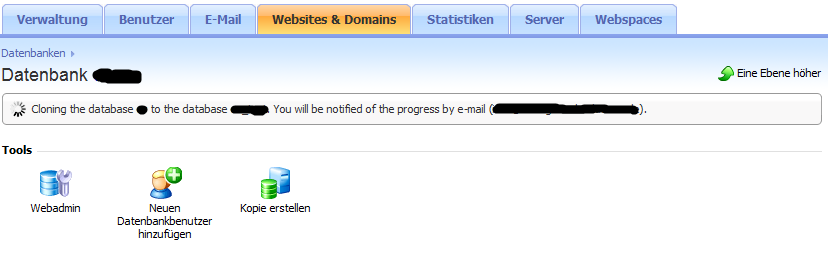Cloning the database *** to the database ***. You will be notified of the progress by e-mail (***@***.de).
