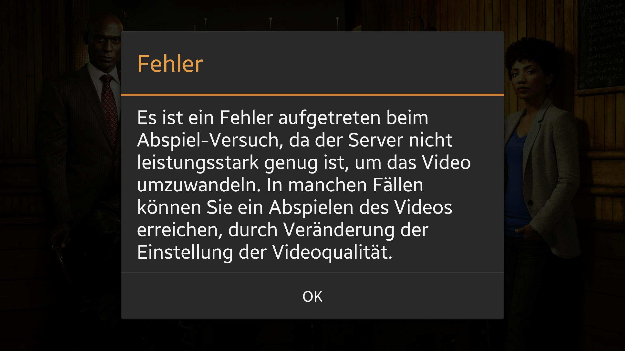 " Es ist ein Fehler aufgetreten beim Abspiel-Versuch, da der Server nicht leistungsstrak genug ist, um das Video umzuwandeln. In manchen Fällen können Sie ein Abspielen des Videos erreichen, durch Veränderung der Einstellung der Videoqualität. (Screenshot vorhanden)