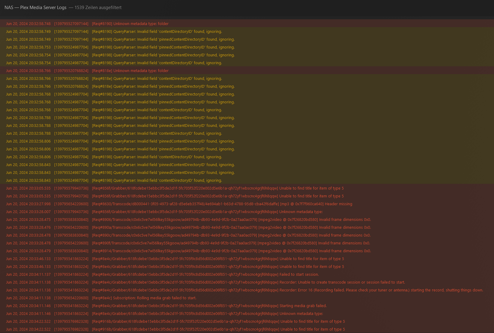 Bisher habe ich ein Downgrade von einer höheren Version zur 1.29 gemacht. Um zu schauen ob das Problem behoben worden ist. Seid der 1.40er Version geht kein Downgrade mehr, da dann Plex sich im Synology Docker beendet und nicht mehr startet! Also kein Aufspielen mehr ohne alles neu einzurichten wieder.