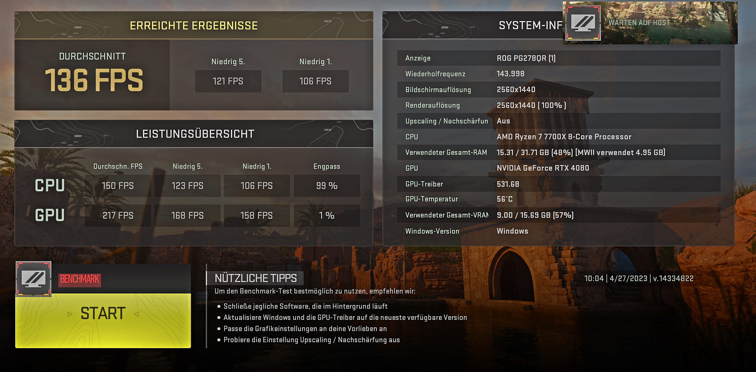 ich spiele aktuell ausschließlich Call of Duty Warzone 2, genauer gesagt den DMZ Modus. Seit einigen Tagen / Wochen hänge ich im CPU Limit, das kam vermutlich durch ein Update des Spiels bzw. durch Season 3 ? Ich kanns garnicht genau sagen, ich erinnere mich an die Zeit um Januar / Februar, als ich mein neues System installiert habe (Ryzen 7 7700X, Nvidia 4080, 32GB Ram, M2 SSD ect).....das Spiel lief im fps Limit von 144 Hz, relativ stabil mit gelegentlichen Ausbrüchen nach unten, aber kaum der Rede Wert. Grafikkarte hing so bei 80 %. Meine Grafikeinstellungen habe ich seitdem nicht verändert.