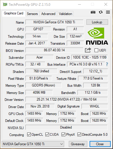 4095MB NVIDIA GeForce GTX 1050 Ti (Acer Incorporated [ALI])
