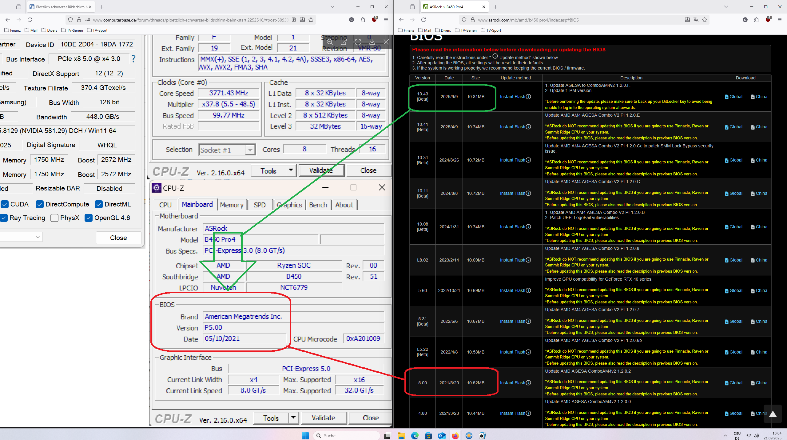 Seit heute am Abend will mein Computer nicht mehr starten, wenn ich die Grafikkarte (Nvidia RTX 5060 Ti) in den oberen PCIe Slot meines Asrock B450 Pro4 Motherboards stecke. Wenn ich den PC einschalten möchte, starten die Lüfter an, jedoch bleibt der Bildschirm schwarz und der PC scheint sich nach kurzer Zeit wieder neu zu starten und bleibt dann in diesem Loop. Wenn ich die Grafikkarte in den untern PCIe Slot stecke, funktioniert alles wieder wie gewohnt.