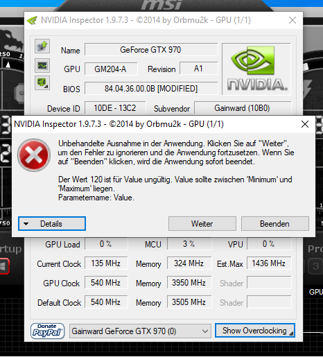 Hab mir dann mal Nvinspector besorgt um mein Bios auszulesen, eventuell könnte es ja das Bios zerschossen haben.. Ist aber alles in Ordnung. Beim öffnen von Nvinspector bekomme ich aber eine Fehlermeldung wo ich als Laie etwas Probleme mit habe aus den Details genaustens rauszulesen was das Problem ist.. Was mir aber auffällt ist dass dort, anfangs der Details Meldung, dass dort folgendes steht: