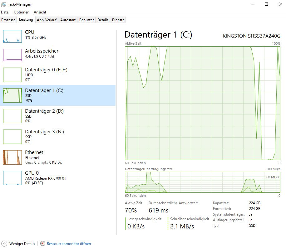 Habe die HDD jetzt physisch vom System getrennt. Leider ohne irgendeine merkliche Verbesserung. Auslastung teilweise noch konstanter bei 100% als vorher. Anwendungen bei der Datenträgerauslastung sind aber nicht wirklich vorhanden, bzw. werden nicht wirklich beansprucht und sind im niedrigen MB Bereich. Wahrscheinlich wird die SSD zugrunde gehen 😞.