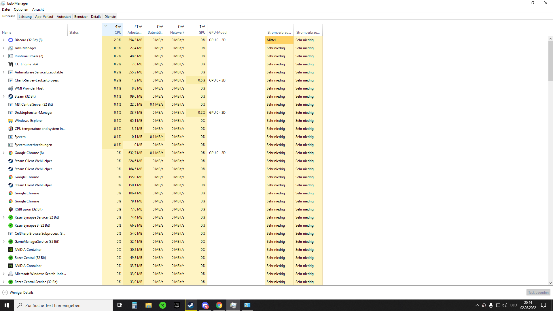 Zunächst, so für 2 bis 3 Wochen, lief der PC super gut (im Vergleich zum alten war es eine deutliche Steigerung weil der alte CPU ein bottleneck war). Als Beispiel dazu hatte ich beim neuen PC in CS:GO auf höchsten Einstellungen immer Mindestens 200FPS und in Warthunder zb. über 150 auf hohen Einstellungen. Dann plötzlich beim Warthunder spielen innerhalb von ungefähr 10 Sekunden sind die FPS gedroppt. Dabei waren dann 70 FPS das höchste was erreicht wurde. Der Mittelwert lag da aber eher bei so 50. In CS:GO konnte ich hab da die Meisten Maps nur noch mit 70 bis 100 FPS spielen und manche nur noch mit 30 FPS was bei einem 144hz Monitor echt besch*ssen ist. Das runter Stellen der Grafikeinstellungen auf das niedrigste hat in beiden Spielen keinerlei Veränderung bewirkt. Habe dann mal den Nvidia Treiber aktualisiert aber auch da keine Veränderung. Hab kein externes Antiviren Programm, nur den Windowsdefender. Hab diesen mal einen kompletten Scan machen lassen, hat aber nichts gefunden. Der CPU war bei den Spielen maximal bis 30% ausgelastet und hat auch die erwarteten Ergebnisse in Cinebench erzielt. Die GPU (erzielt im Benchmark auch erwartete Werte) ist in den Spielen allerdings im Bereich "3D" im Taskmanager bei 100%, während der VRAM nur bei so bei 30-40% Auslastung liegt. Die Temperaturen von CPU und GPU liegen unter Last nur bei ca. 50° bis 60°. Der Ram wird auch nicht mal zur Hälfte ausgelastet. Habe die Spiele auch mehrmals auf andere Festplatten/SSD installiert und deinstalliert aber auch dadurch keine Verbesserung. Energieoptionen sind auf "Höchstleistung". Andere Programme welche Ressourcen "klauen" habe ich nicht offen bzw. sehe ich keine im Taskmanager.
