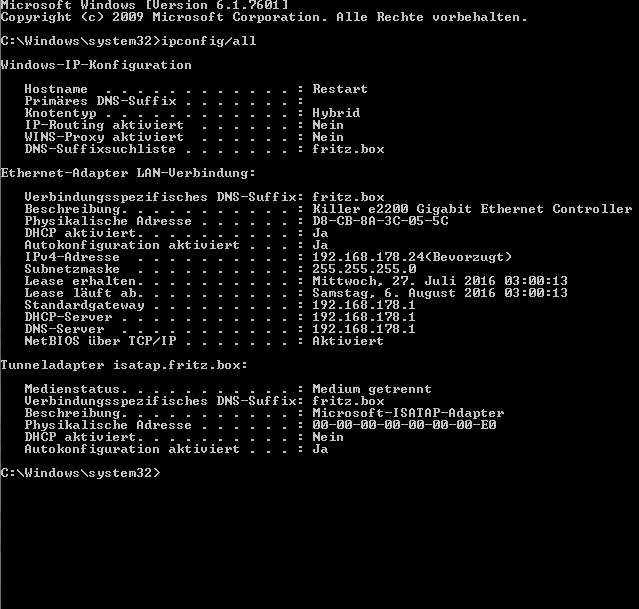 Daher kann ich euch vielleicht mit meiner IPConfig aus der CMD.exe von Windows weiterhelfen. So schaut es da aus: