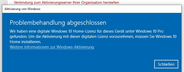 In der Problembehandlung bei den Einstellung unter Aktivierung kommt als Meldung, dass hier eine digitale Windows 10 Home Lizenz unter Windows 10 Pro vorhanden sei und ich solle eine Windows 10 HOME instalieren.
