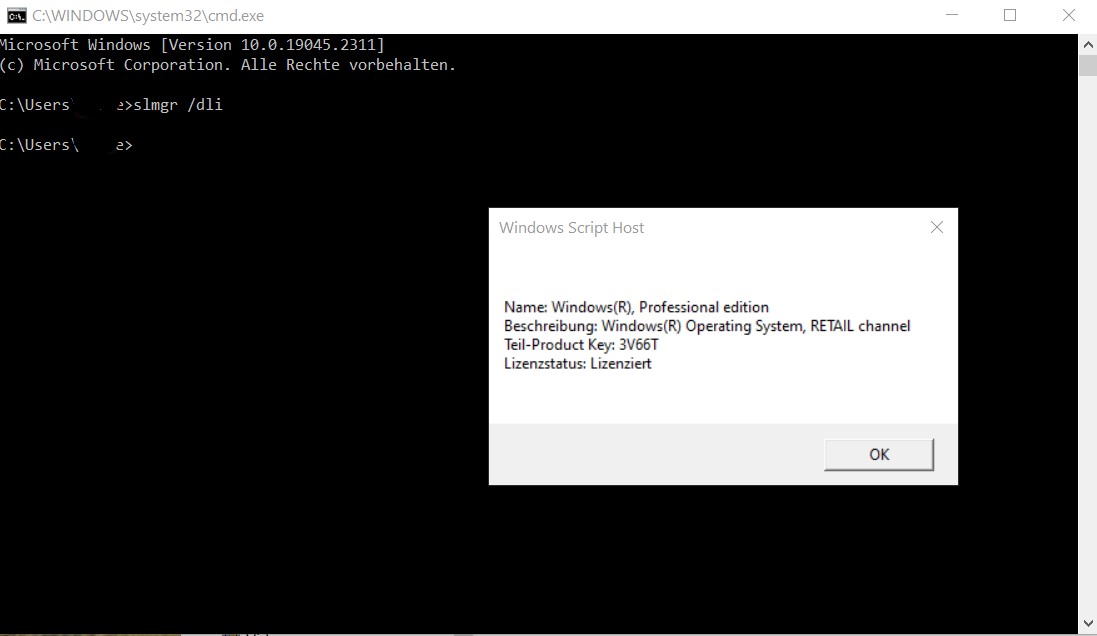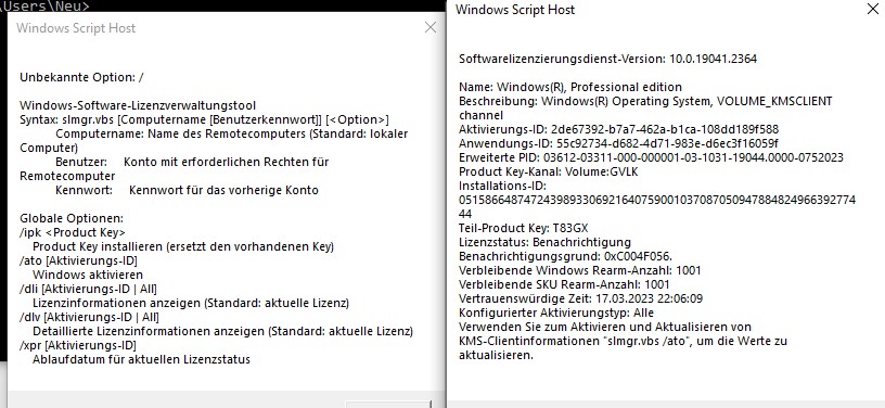 zuerst kamen mit cmd diese beiden Meldungen, dann nach Klick auf OK eine lange 3. MeldungTerrier schrieb:CMD ausführen und dann musst du doch slmgr /dlv so zusammen eingeben.
