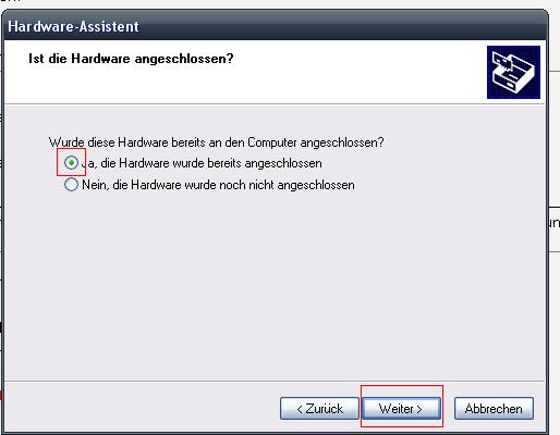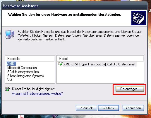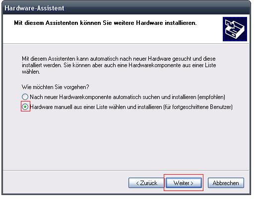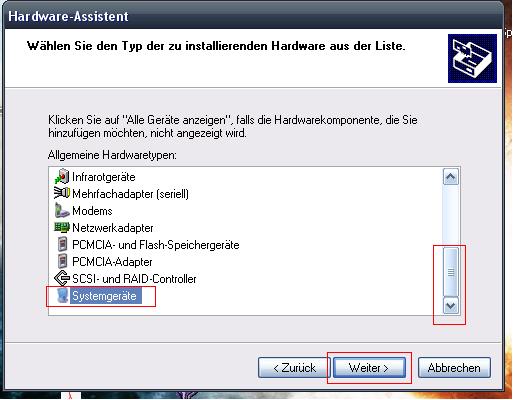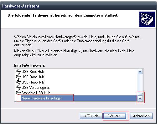 Wenn die erste Liste mit Komponenten erscheint, ganz runterscrollen auf "neue Hardware" -> Weiter -> Datenträger