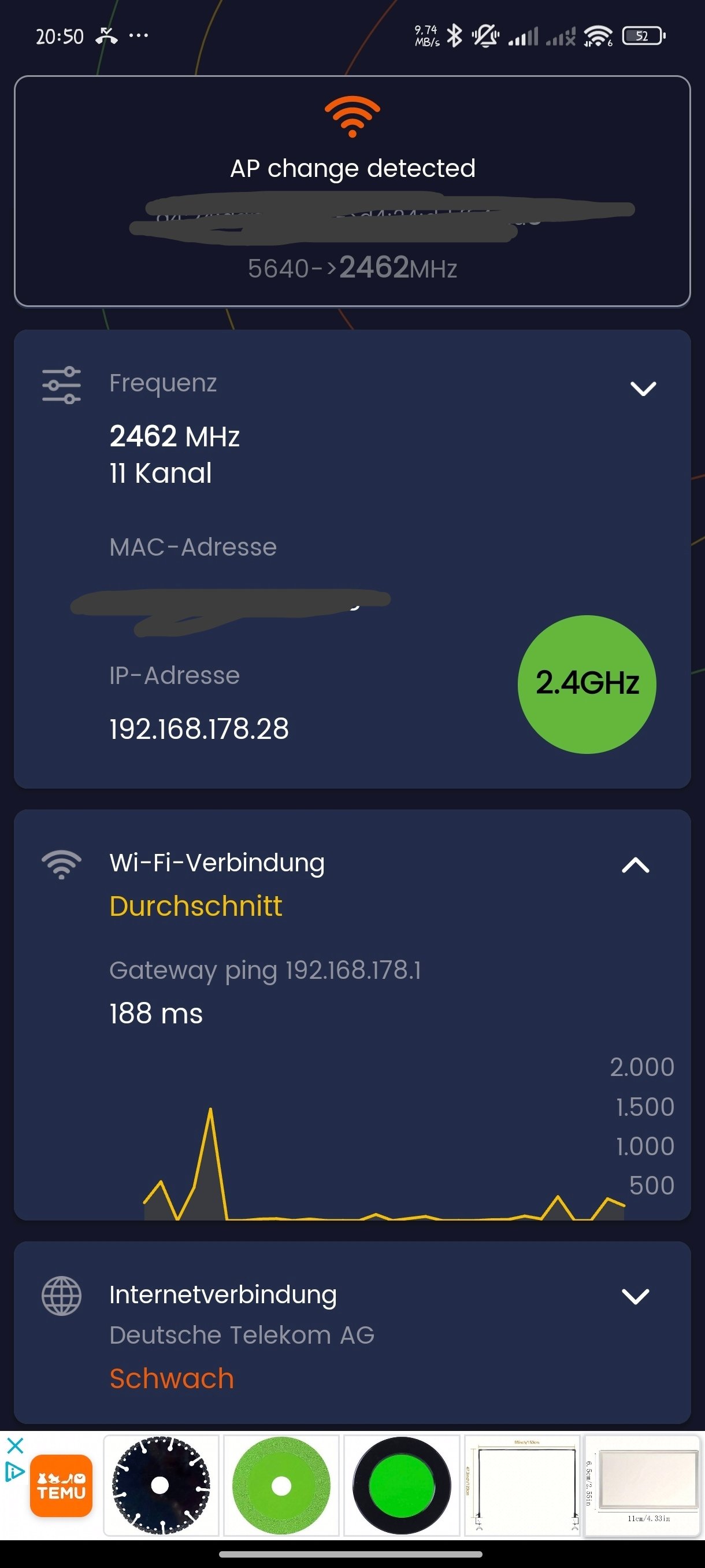 Mein Smartphone wechselt in einer Tour zwischen 5 GHz und 2,4 GHz, dadurch wird natürlich immer wieder kurz die Verbindung unterbrochen und die Latenzen gehen rauf. Ich hab das ganze vorhin mal mit der App WiFi Heatmap und 2 anderen Smartphones getestet. Während das Poco X6 Pro und das Poco C65 permanent im 5 GHz Netz bleiben und eine Latenz von 5 bis 40ms haben, bleibt mein Gerät 5 bis 60 Sekunden in einem der beiden Netze und hat aber Latenzen zwischen 5 bis 2000ms und immer wieder steht dort auch 0ms was technisch unmöglich ist.