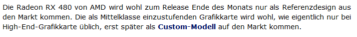 Irgendwo stand, dass die Custom-Designs 2 Wochen später rauskommen ... also am 29. die Referenzdesigns und 2 Wochen später die Customs ... kann/konnte aber auch so gemeint sein, dass die Customs mit Referenztakt auch schon am 29. kommen, aber die OC-Varianten erst später.ThePower schrieb:Schade das hört man natürlich gar nicht gerne, erst Recht nicht, wenn man wie ich vorgestern seinen neuen Rechner zusammen gebastelt hat und noch die passende GPU fehlt... Bin trotzdem guter Dinge das auch ein paar Custom Designs der Karte direkt verfügbar sein werden. Halte es für sehr unwahrscheinlich, das die bei WCCFtech gehandelten OC Ergebnisse von bis zu 1,5 GHZ mit einem Referenz Design erzielt wurden.