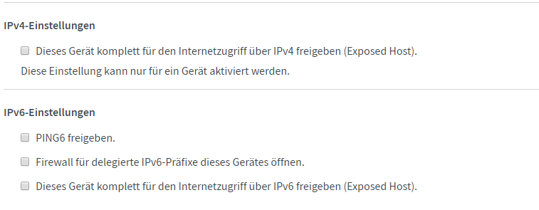 Die Einstellung "Dieses Gerät komplett für den Internetzugriff über IPv4/IPv6 freigeben (Exposed Host)." habe ich auch schon getestet.