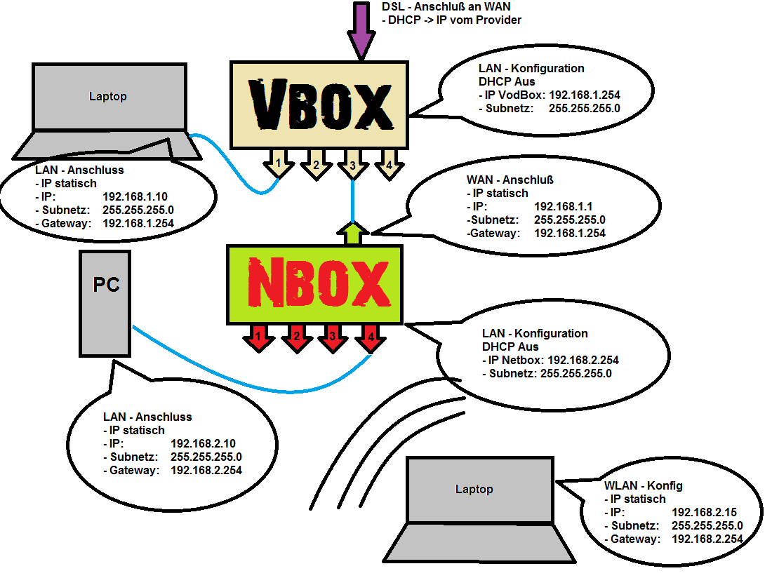 Alsoooooo... da ich nicht weiß ob dein Netzwerk überhaupt korrekt eingerichtet ist, hab ich dir mal eine Beispielkonfiguration aufgemalt.
