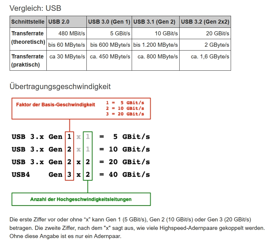 Und aufpassen, Geräte und Kabel müssen den jeweiligen Standard unterstützen! Falsches Kabel und es läuft nicht (mit dem angegebenen Speed). So viel zur Universalität von USB-C.