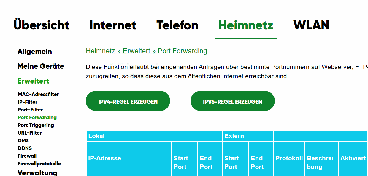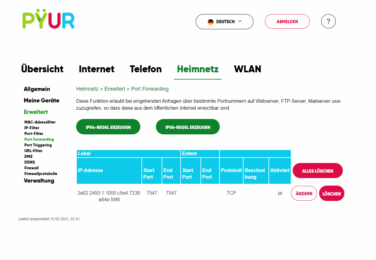 Ich möchte gerne für eine VPN Verbindung am TeleColumbus CH7485E Ports freigeben. Nun hab ich mich über den Webzugriff auf das Gerät eingeloggt und die Daten eingegeben die ich brauche.