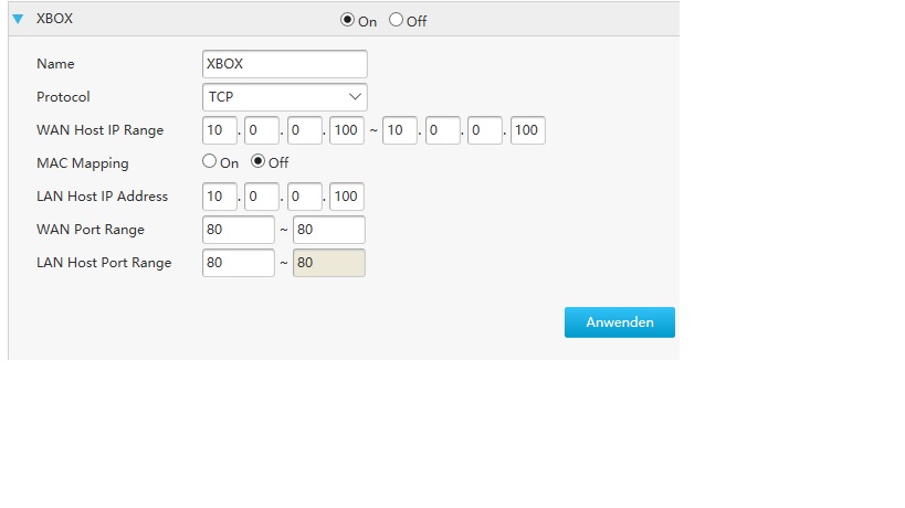 Die XBOX hat die fixe IP 10.0.0.100 und 1 Bsp. für Portweiterleitung angehängt. Es funktioniert leider damit auch nicht.