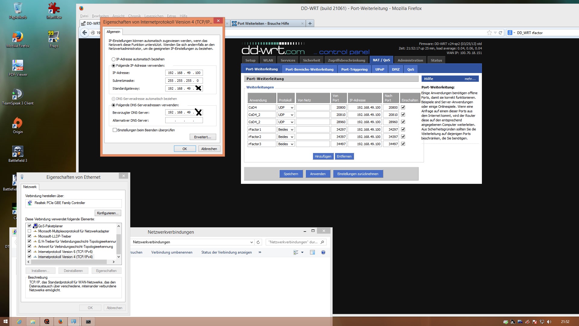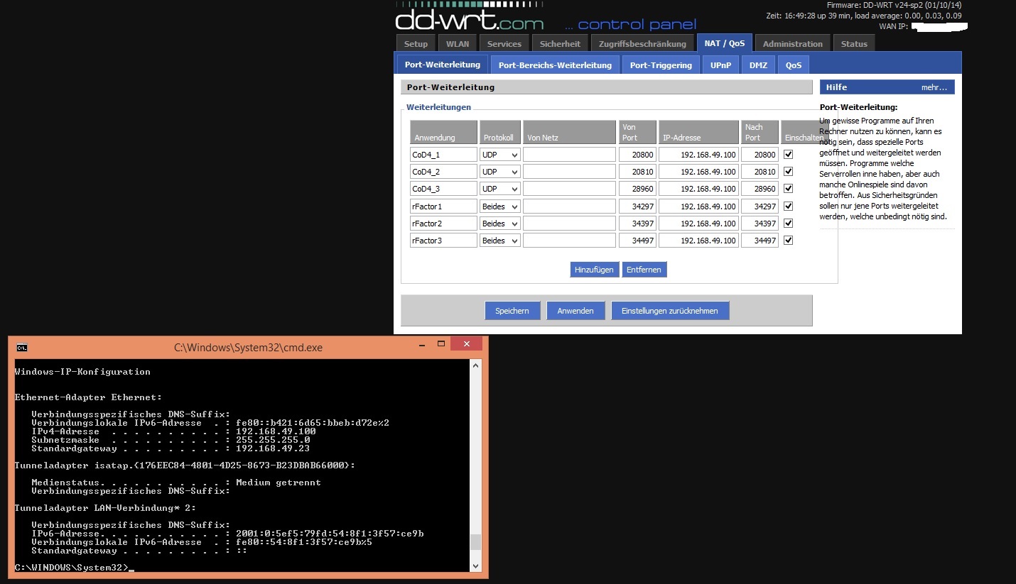 Ich bekomme ums verrecken die Portweiterleitung für rFactor1 nicht zum Laufen. Anbei mal ein Screenshot der Routeroberfläche und der IP Config. In der Netzwerkmaske habe ich die letzte Zahl der Router IP mit X gekennzeichnet.