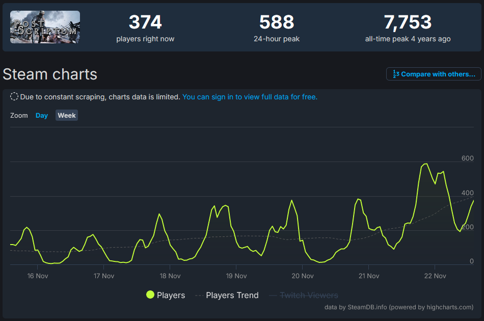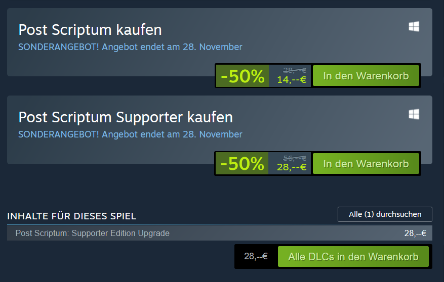 Post Scriptum wird wohl nun wiederbelebt und vom Publisher Offworldindustries weiter geführt. Somit dürfte die Spielerzahlen wieder hoch gehen. Überlege mir das vielleicht zu kaufen. Kostet aktuell bei Steam 14€.