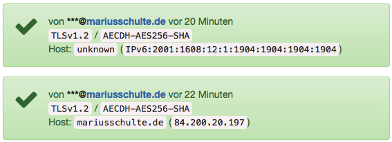 ich habe einen Postfix Mailserver mit Dovecot. Das Problem besteht generell darin, dass die Mails teilweise nicht ankommen. Bis heute Mittag, kamen die Mails mit IPv6 an, wobei der Hostname nicht bekannt ist (Reverse DNS ist gesetzt, sowohl bei IPv4 als auch v6).