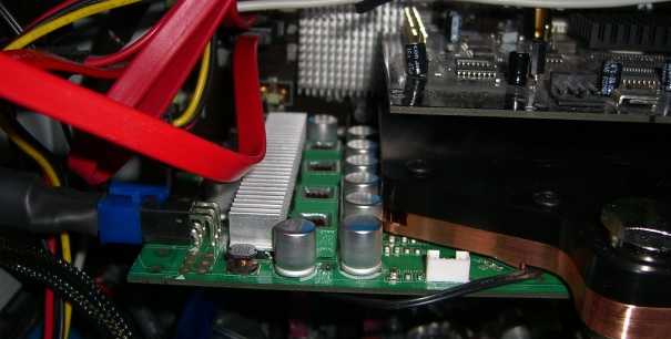Zur Erklärung: Rechts sieht man noch die Aussparung für den Stromanschluss, links saß die Slotblende. Der Lüfter sitzt auch an einer ungewöhnlichen Stelle. Die Temperaturen waren trotz 13% im IDLE nicht schlecht (so 55°C Chip), aber er war mir zu laut (liegt wieder seelenruhig unter Wasser). Im Load hatte er maximal 65°C