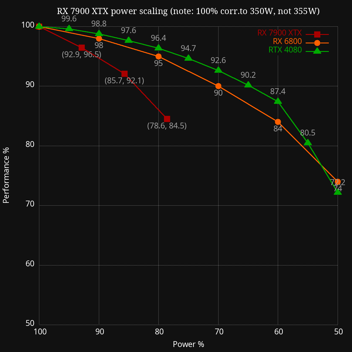 Schade, dass die RX 7900 XTX nicht so gut Power-skaliert. Die 355 Watt TDP gefallen mir prinzipiell nicht, vor allem weil sie oft anliegen, deswegen warte ich auf 7800(XT)/7900 GRE (wenn einzeln im Verkauf). Rohdaten nicht von mir, aber der Plot. Daten zur RX 7900 XTX, Daten zur RX 6800 und RTX 4080 findet man, wenn man im Internet nach '.. power scaling' sucht. Alles zusammen: