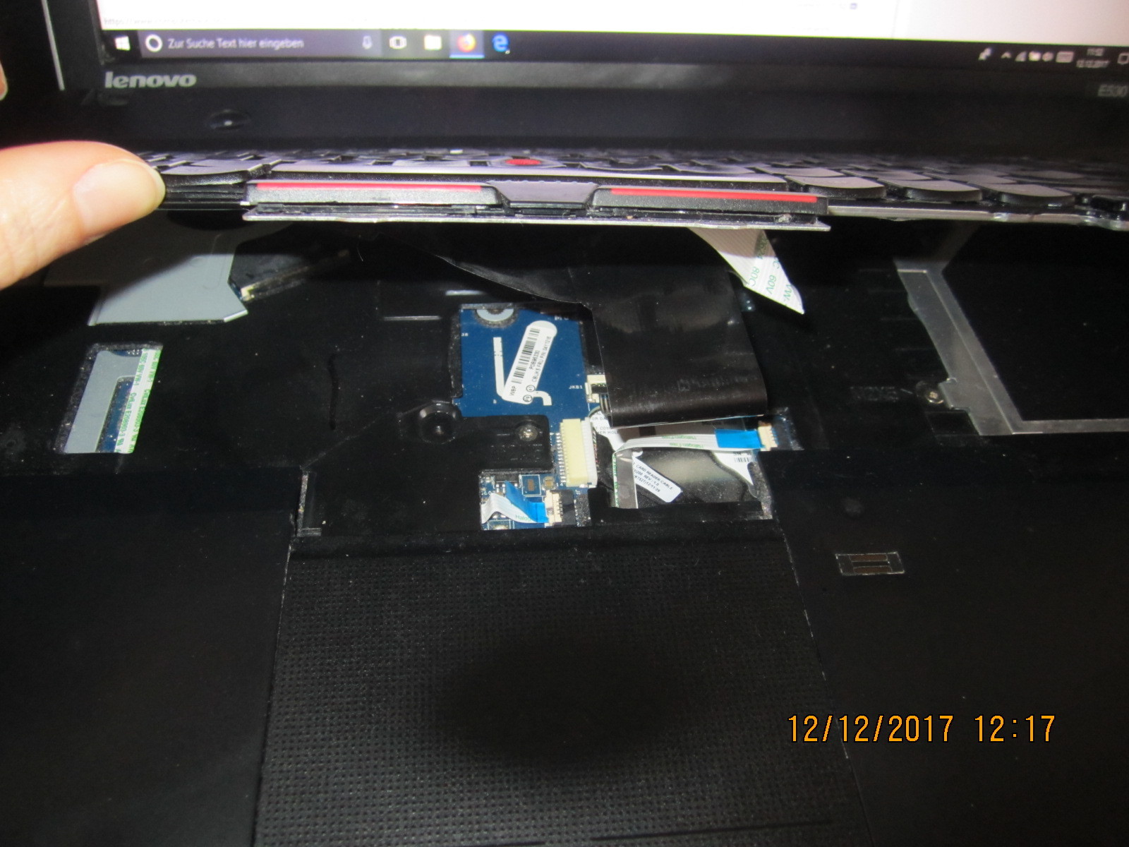 Ich habe ein Lenovo Thinkpad E530. Während ich das Gerät benutz habe, hat plötzlich das Touchpad nicht mehr funktioniert. Der rote Trackball ging aber noch. Kurz darauf ging das Notebook aus, aber kurz darauf selbständig wieder an. Ich drückte etwas heftiger am touchpad herum, woraufhin wieder alles aus ging. Ich habe im Grunde keine Ahnung von Computern, habe aber daraufhin die Tastatur heraus gehebelt (die ist seit Ewigkeiten so locker bei mir, hat sich wohl innen mal eine Schraube verabschiedet - oder ist die bei Lenovo nur so "rein gesteckt"?)