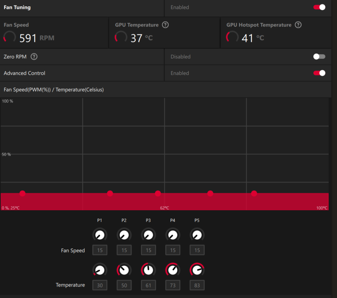 Die Drehzahl lässt sich außerdem auf 15% festlegen, was ca. 725rpm entspricht. Ich könnte also alternativ auch auf Zero-Fan verzichten und 725rpm im Desktopbetrieb dauerhaft laufen lassen. Dann bleibt die GPU konstant bei 33 Grad auch beim Video schauen.