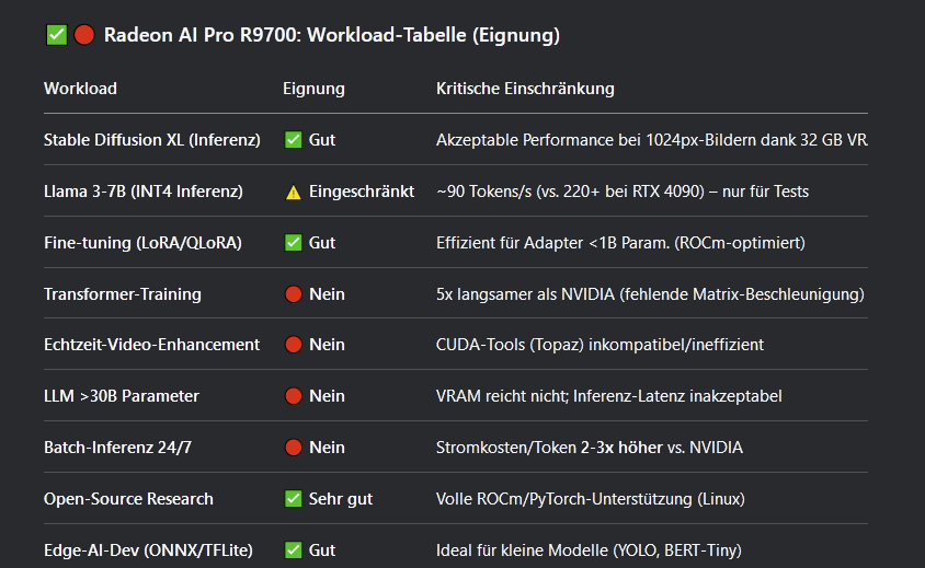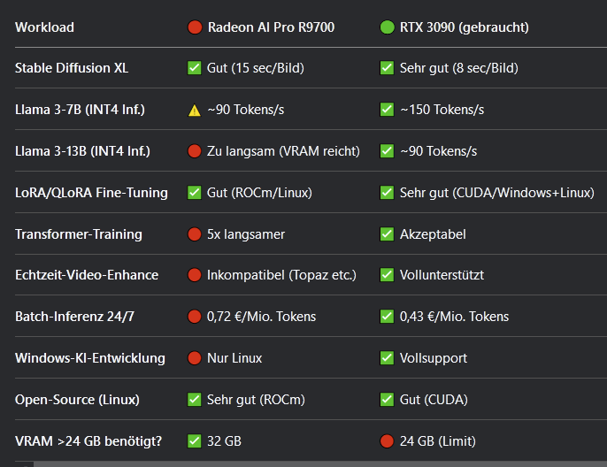 Ich habe bisher nur News und keine Benchmarks zur AI Pro R9700 gefunden. Deshalb wundert es mich dass diese Quelle bereits solche Ergebnise veröffentlicht. Und dass LLama 3-13B mit Int 4 bei der AI Pro R9700 am Speicher scheitern soll und die RTX3090 nicht, wundert mich erst recht.