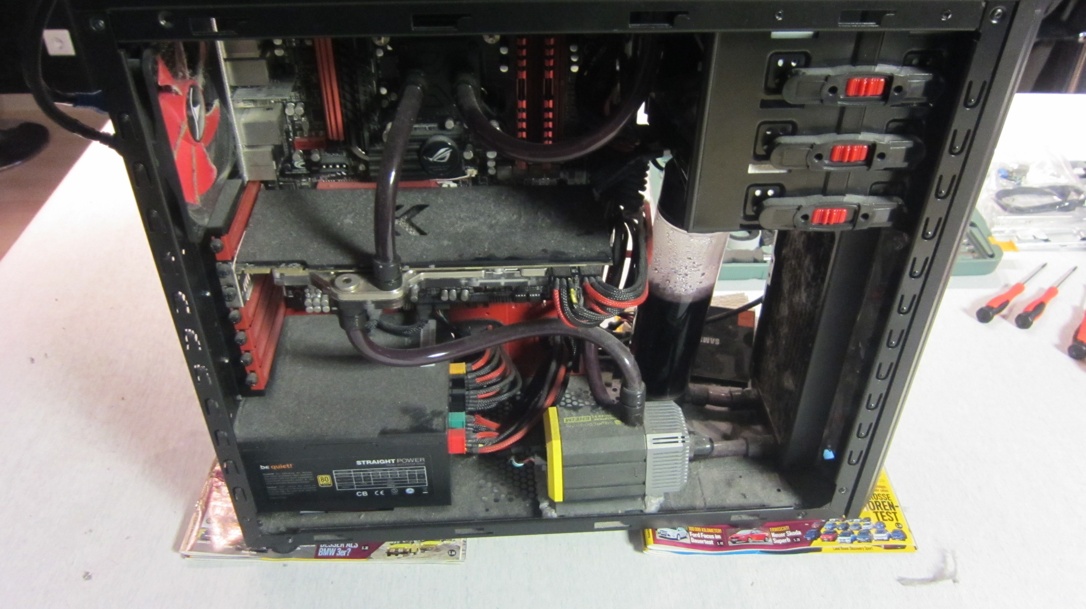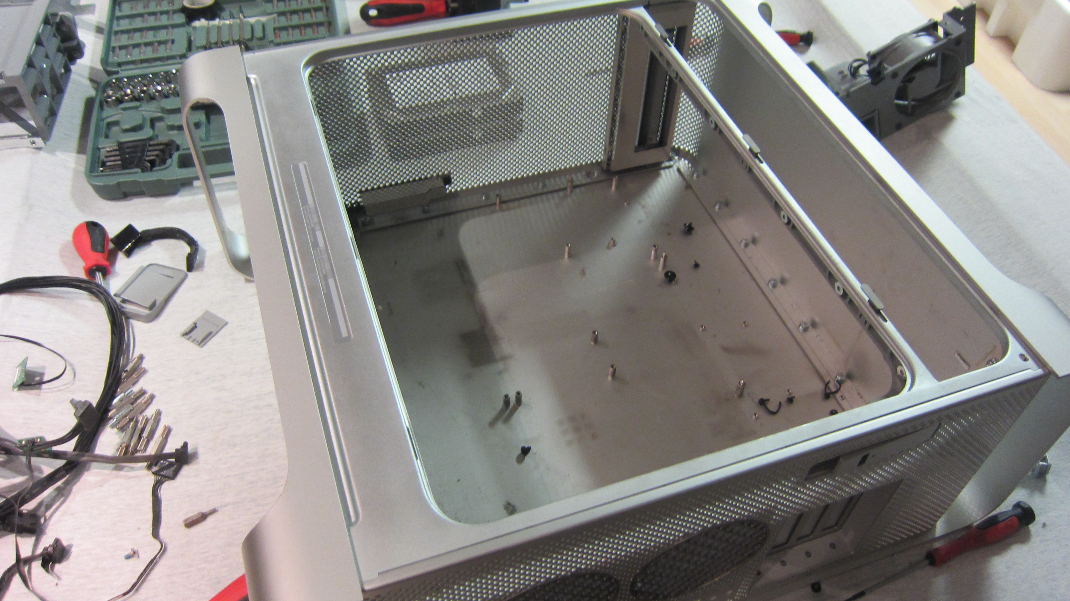 Als erstes ging es auf die Suche nach einem passenden (aka nicht zu verkratzten) G5 Case. Dies gestalltete sich durchaus schwierig, allerdings wurde ich fündig und das Entkernen der alten Hardware konnte beginnen. Man beachte, dass es sich um ein Gehäuse inklusive Hardware Anno 2004 handelt.