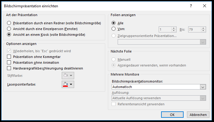 ich habe mit PowerPoint 2013 eine Präsentation und über den Reiter "Bildschirmpräsentation -> Bildschirmpräsentation einrichten" den Kiosk-Modus aktiviert (Vollbild und durchlaufen in Endlosschleife).
