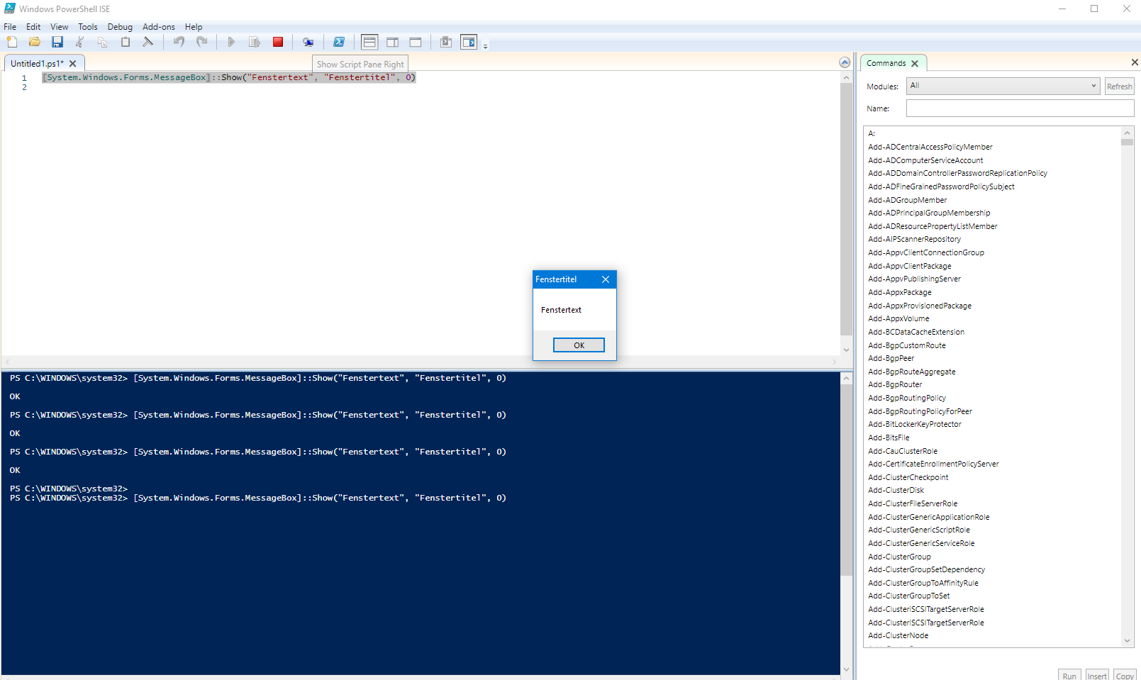 >> [System.Windows.Forms.MessageBox]::Show("Test", "Fenstertitel",[System.Windows.Forms.MessageBoxButtons]::OK)
