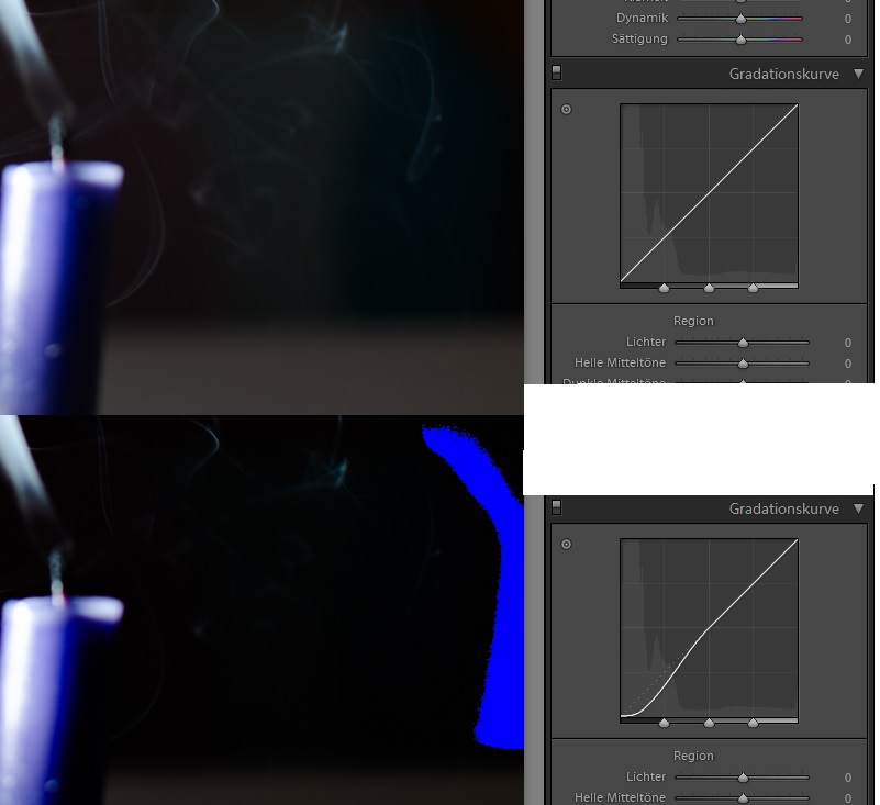 Ich habe allerdings ein Problem: Ich bin gerade viel am testen und am Regler hin und her schieben um die Effekte zu testen, dabei kommt es häufig vor, das die dunklen Bereiche blau werden (siehe Bild). zum beispiel dann wenn ich die Helligkeit der dunklen Mitteltöne oder der Tiefen runter drehe. Auch bei vielen anderen Aktionen passiert das.