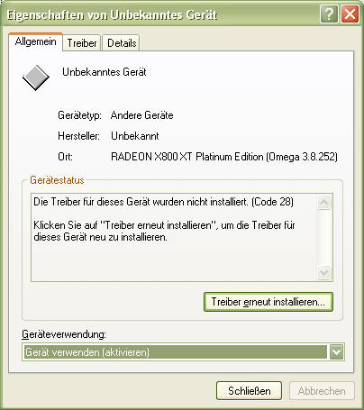 Ich habe nur ein Problem. Im Gerätemanager steht nun ein unbekanntes Gerät drin, für das auch kein Treiber gefunden wird. Im Anhang sind die Screenshots. Wie bekomme ich das weg? Unter GraKa steht die X800XT-PE normal und als Secondary drin.