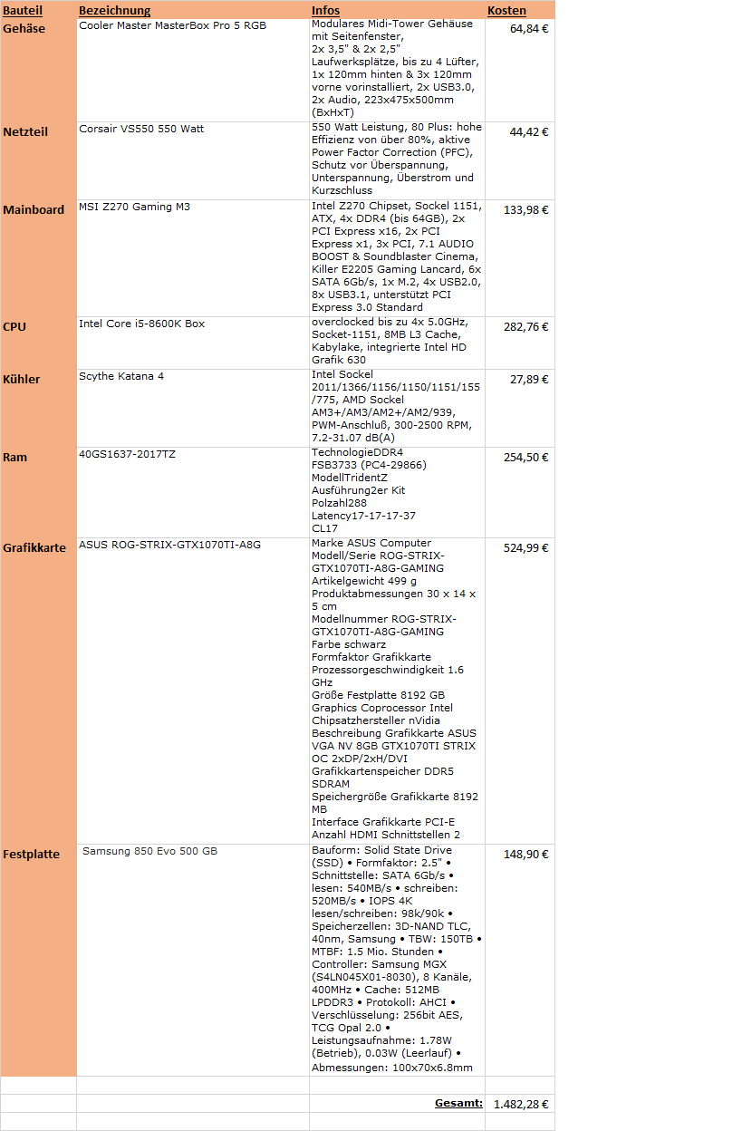 Danke für den Hinweis, habe wohl vergessen die Beschreibung zu ändern, da ich mehrere Komponenten im Nachhinein geändert habe. Welcher haken sollte das denn sein? Warum sollte ich für das gleiche Produkt mehr Geld ausgeben wie nötig?! Wenn man mal außen vor lässt, dass nicht jeder Händler die gleichen teile anbietet, dann wäre es doch total dämlich, für ein Produkt mehr Geld auszugeben wie nötig. Vorallem, wenn es um einen kompletten pc geht. Dann kann ich lieber das Geld nehmen, was ich spare und dies z.b. in eine hochwertigere grafikkarte investieren. Außerdem ist der beschriebene preis der endpreis also sind die Versandkosten der Komponenten bereits im Preis inbegriffen.