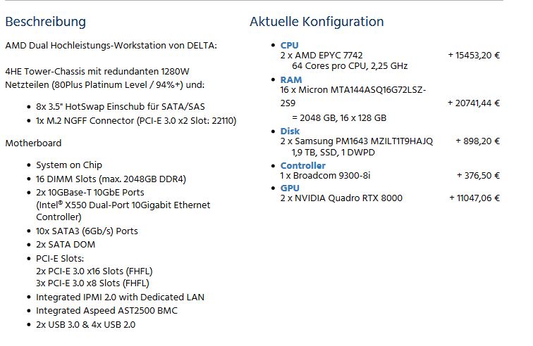 Delta für 50.176,43 €; siehe Screenshot) gehen kann und sich Systeme mit 256 Threads und zwei Quadro RTX 8000 zusammenstellen könnte.