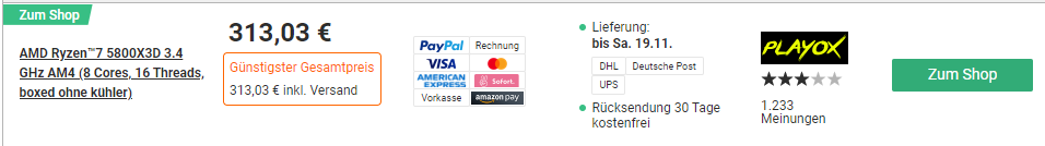 Vorhin war der 5800x3D kurz für 313€ gelistet. Da wäre ich fast schwach geworden.