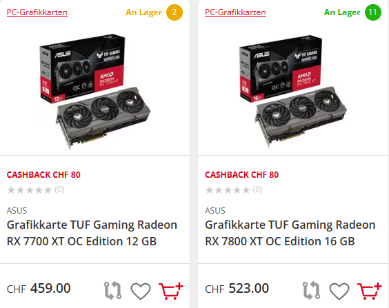Somit kann man zumindest im kleinen benachbartem Bundesland eine Tuf 7700xt für 398 Euronen und eine 7800xt für 464 Euronen erwerben.