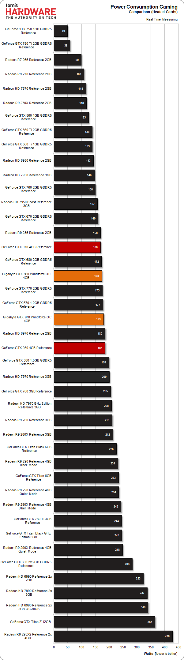 Was ich nach all den Tests und den Messungen von TH weiß ist, dass eine GTX 970 OC in etwa so schnell ist wie eine 290X @ 1GHz, verbraucht allerdings niemals 100W weniger, wobei auch 50W weniger bei gleicher Leistung ein gutes Argument ist.
