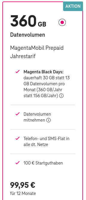 Das gefällt mir. Zusätzlich bekommt man bei Abschluss des Black-Jahrestarifs noch ein T-Phone 3 für 3€ dazu. Das muss man ja nicht benutzen, sondern kann es weiterverkaufen...0x8100 schrieb: