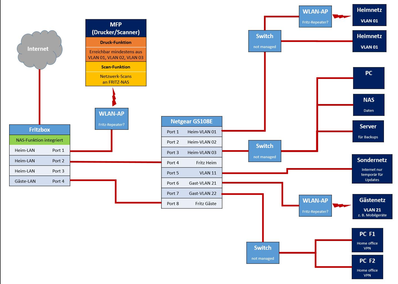 4. Den lila-Bereich links ( VPN Knoten ) über den Switch mit einem Vlan komplett vom blauen Bereich trennen, oder über die Fritzbox7390 ausreichend oder zusätzlich wie am besten aufstellen / konzipieren?