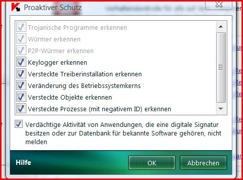 gestern Abend habe ich mein System nochmals von Kaspersky Internet Security 2009 (Vers. 8.0.0.506) scannen lassen. Bis auf divese Schwachstellen wurde nichts gefunden. Allerdings ist mit bei den Einstellungen es Proaktiven Schutzes aufgefallen, dass die Suche nach Trojanischen Programmen, Würmer erkennen und P2P-Würmer erkennen, nicht aktivieren lässt.