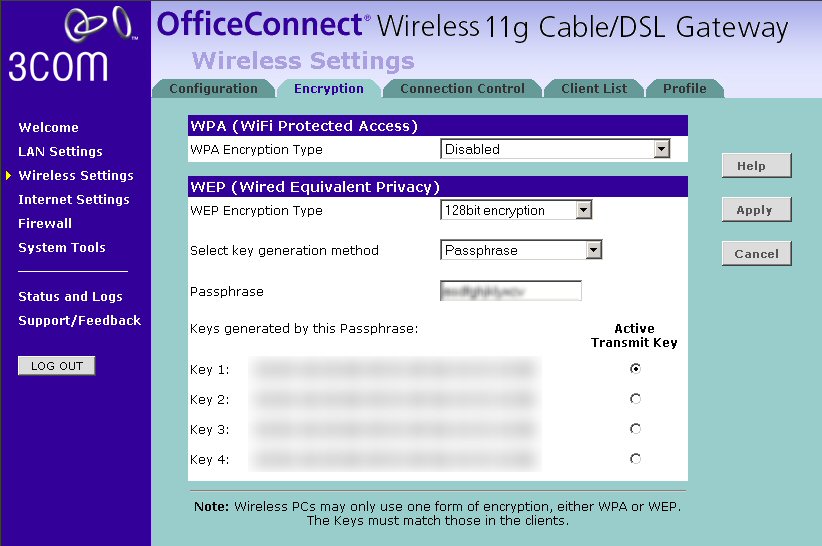 Ich habe mir nen Wireless-Router zugelegt und zwar den OfficeConnect Wireless 11g Cable/Dsl Gateway von 3Com. Ziel der Anschaffung war, dass ich mit meinem Notebook (Asus M2400N - Centrino) per WLan online gehen kann. Sofern ich die Verschlüsselung ausgeschaltet lasse funktioniert das auch prima nur sobald ich die WEP-Verschlüsselung aktiviere geht nix mehr. Der Router registriert bei eingeschalteter Verschlüsselung mein Notebook nichtmal mehr. Da ich den Router als DHCP-Server laufen lasse, lasse ich die IP automatisch vergeben was sofern ich per Kabel am Router hänge oder die Verschlüsselung aus ist auch super geht. Sobald ich die Verschlüsselungseinstellung im INTEL ProSET (dem Konfigurationstool des integrierten WLans) dem des Routers anpasse funzt die automatische IP-Vergabe net mehr. Wenn ich in der Eingabeaufforderung per ipconfig die Einstellungen überprüfe hat mein WLan-Adapter die IP 0.0.0.0 was ja totaler Schrott ist.