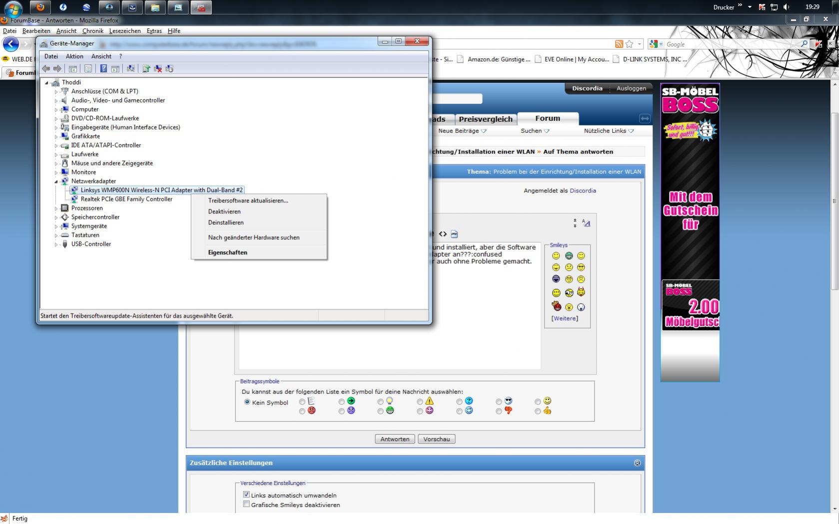 Ich habe mir eine Netzwerkkarte von Cisco /Linksys Dual-band Wireless-N PCI Adapterkarte mit der Kennung WMP600N zugelegt, habe sie eingebaut und installiert, wie ich das normaler weise kenne. Doch Nachdem ich neustarten musste, und die Installation weitergeht, checkt er den Adapter und meldet mir, das er das Gerät nicht finden kann.. Windows selbst erkennt die Karte, hält sie aber deaktiviert, egal ob ich sie manuell aktiviere.