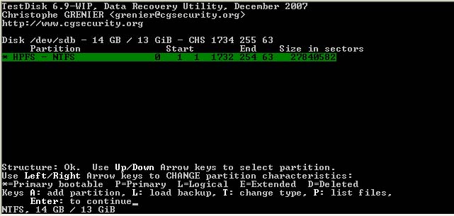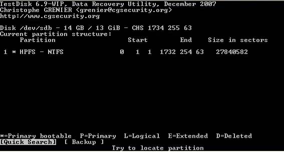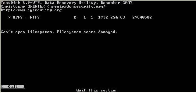 Testdisk ist primär ein Tool um die Partitionstabelle wieder herzustellen, aber hier liegt Dein Problem nicht, im letzten Bild hast Du wahrscheinlich schon probiert mittels Option P den Inhalt der Partition anzeigen zu lassen, was fehlschlug.