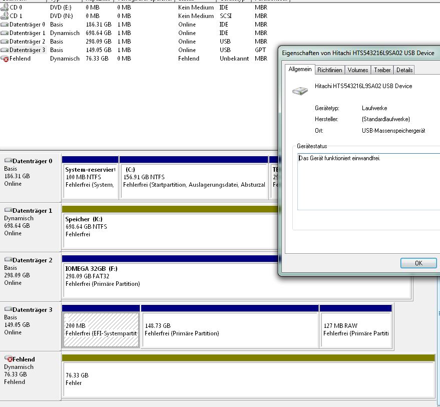 Ich habe hier eine externe 2,5"-Hitachi-Deskstar-Platte, die von Windows (7 und XP) nicht erkannt wird. In der Datenträgerverwaltung wird sie angezeigt und ist komischerweise in 3 Partitionen unterteilt. Die Partitionen kann ich weder löschen, noch ändern noch kann ich die ganze Platte einfach frisch formatieren. Kann mir jemand sagen, was zu tun ist und was es mit dieser "EFI-Systempartition" auf sich hat?