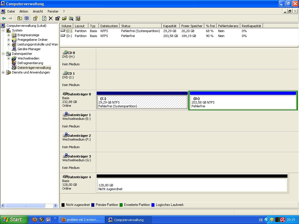also ich hatte die tage meinen pc neu aufgesetzt (win xp) dabei hatte ich eben auf meine 2 externen festplatten meine ganzen videos bilder und andere daten eben gesichert danach hab ich halt die windows cd eingelegt und hab eben erst die partitonen gelöscht leider.... und jetzt kommt hatte ich noch meine 2 externen festplatten angeschlossen und hab aus versehen nur diese beiden partitionen gelöscht habs aber sofort bemerkt.